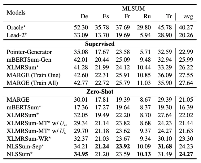 实验结果表明,模型 NLSSum 在多语言摘要数据集 MLSUM 的所有语言上大幅度超越 Baseline 模型的分数。其中在俄语(Ru)数据集上,零样本模型性能已经接近使用全量监督数据得到的模型。