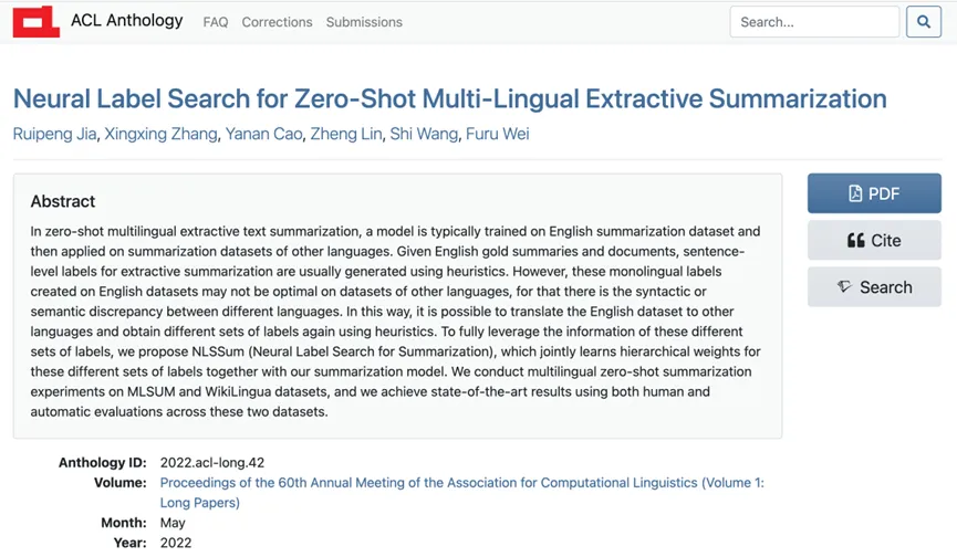 中国科学院信息工程研究所和微软亚洲研究院联合提出一种是基于 Zero-Shot 的多语言抽取式文本摘要模型。具体方法是使用在英文上预训练好的抽取式文本摘要模型来在其他低资源语言上直接进行摘要抽取;并针对多语言 Zero-Shot 中的单语言标签偏差问题,提出了多语言标签(Multilingual Label)标注算法和神经标签搜索模型(Neural Label Search for Summarization, NLSSum)。