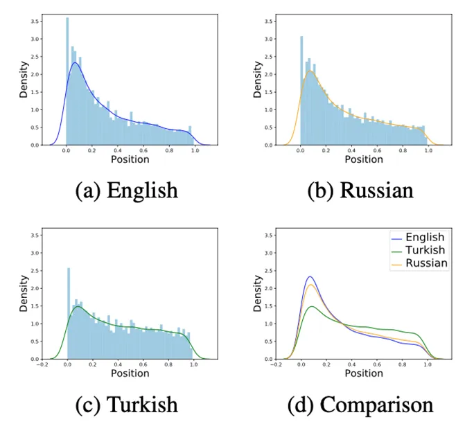 如下图 3 所示,通过可视化分析进一步研究不同语言间重要信息的分布位置,从中可以看出英文语言中重要信息分布较为靠前,而其他语言中的重要信息则比较分散,这也是多语言标签能够提升模型性能重要原因。 图 3:不同语言中摘要句子的分布位置。