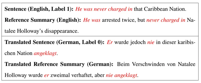 如上表 1 样例所示,这个例子是摘要领域目前最常见的 CNN/DM 数据集中选取的部分文档。CNN/DM 是一个英文数据集,示例中上半部分的即为原始文档中的英文表示和人工编写的英文摘要;示例中的下半部分是使用微软开源的工业级翻译模型 Marian,将英文的文档和摘要全部翻译为德语。示例中的这句话和人工编写的摘要具有较高的相似性,因此会得到较高的 ROUGE 分数。