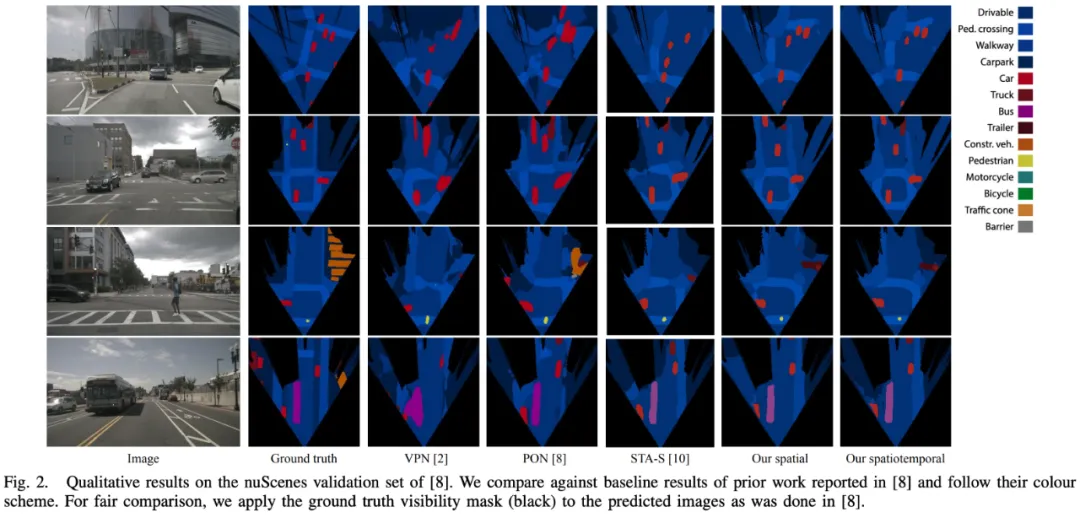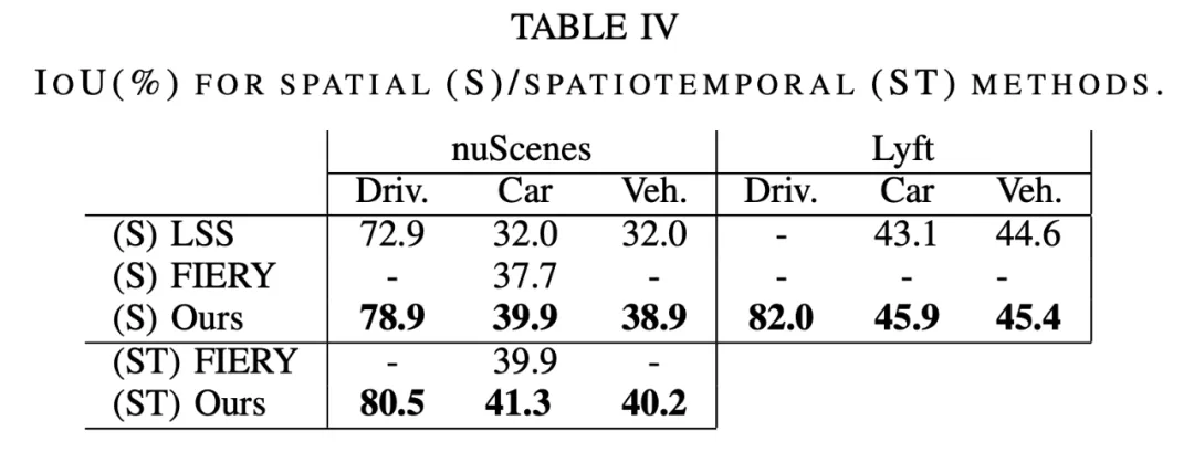如下表 4 所示,本文方法在 nuScenes 和 Lyft 上的表现优于 LSS [9]和 FIERY [20]。在 Lyft 上进行真正的对比是不可能的,因为它没有规范的 train/val 分割,而且无法获得 LSS 所使用的分割。