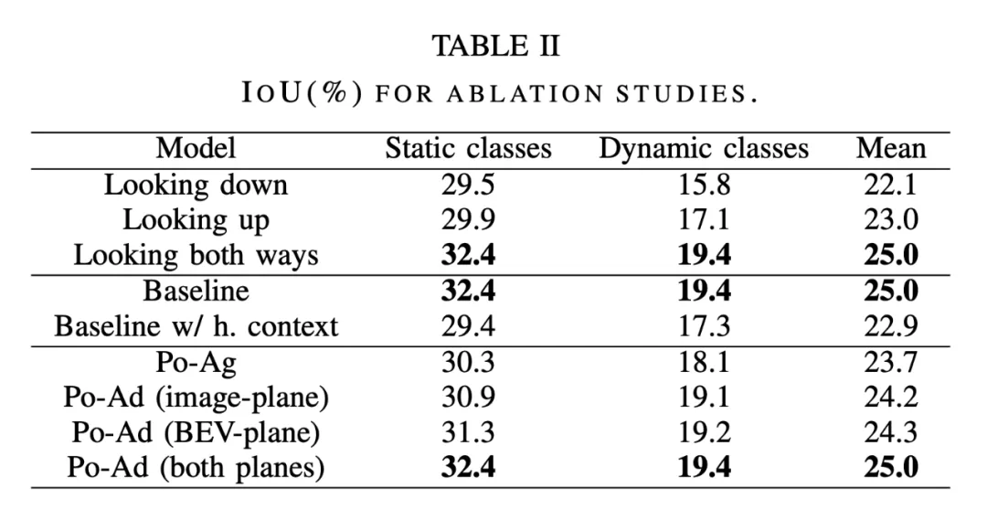 Polar-agnostic vs polar-adaptive Transformers:表 2 最后一部分比较了 Po-Ag 与 Po-Ad 的变体。一个 Po-Ag 模型没有极化位置信息,图像平面的 Po-Ad 包括添加到 Transformer 编码器中的 polar encodings,而对于 BEV 平面,这些信息会加入到解码器中。在任何一个平面上添加 polar encodings 都比在不可知模型上添加更有益处,其中动态类的增加最多。将它添加到两个平面会进一步强化这一点,但对静态类的影响最大。