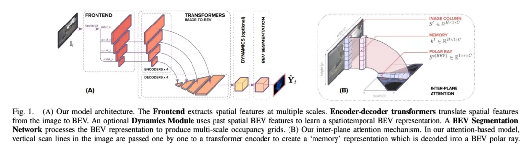 研究者将基于 Transformer 的对齐模型嵌入到一个端到端学习公式中,该公式以单目图像及其固有矩阵为输入,然后预测静态和动态类的语义 BEV 映射。