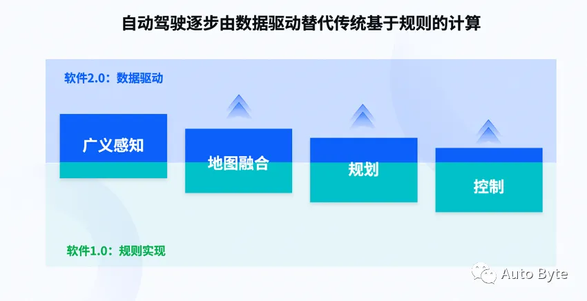 广义感知其实包含了传统意义上的传感器,同时高精地图和导航信息也可以认为是一种感知输入。所以在新的自动驾驶算法框架下,通常会将更多的信息融合在一个可以端到端、完全数据驱动自动化学习和训练的环节当中,以此大幅提升自动驾驶系统的精度、鲁棒性、适用度,也可以大幅地改进算法迭代的速度。