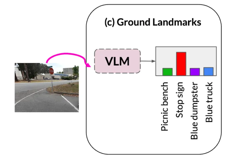 3、视觉 - 语言模型(VLM)被用来在特征点短语上的基础上建立视觉观察结果。视觉 - 语言模型推断出一个关于特征点描述和图像的联合概率分布(形成上述图形中的节点)。