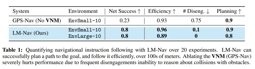 表 1 总结了该系统在 20 条指令中的量化表现。在 85% 的实验中,LM-Nav 能够始终遵循指令,没有发生碰撞或脱离(平均每 6.4 公里的行进有一次干预)。与无导航模型的 baseline 相比,LM-Nav 在执行高效、无碰撞的目标路径方面一直表现得更好。在所有不成功的实验中,失败可归因于规划阶段的能力不足——搜索算法无法直观地定位图中的某些「硬」特征点—导致指令的不完整执行。对这些失败模式的调查表明,系统中最关键的部分是 VLM 检测不熟悉的特征点的能力,例如消防栓,以及在具有挑战性的照明条件下的场景,例如曝光不足的图像。