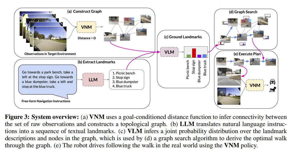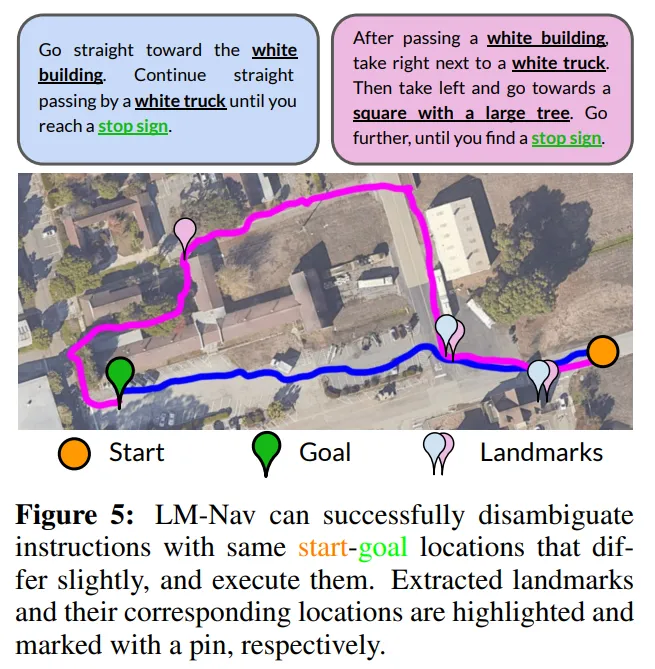 图 4(b) 强调了 LM-Nav 解析有多个特征点的指定路线的能力—尽管在无视指令路径的情况下,直接到达最后的特征点是最短路线,但机器人仍然能找到了一条以正确顺序访问所有特征点的路径。