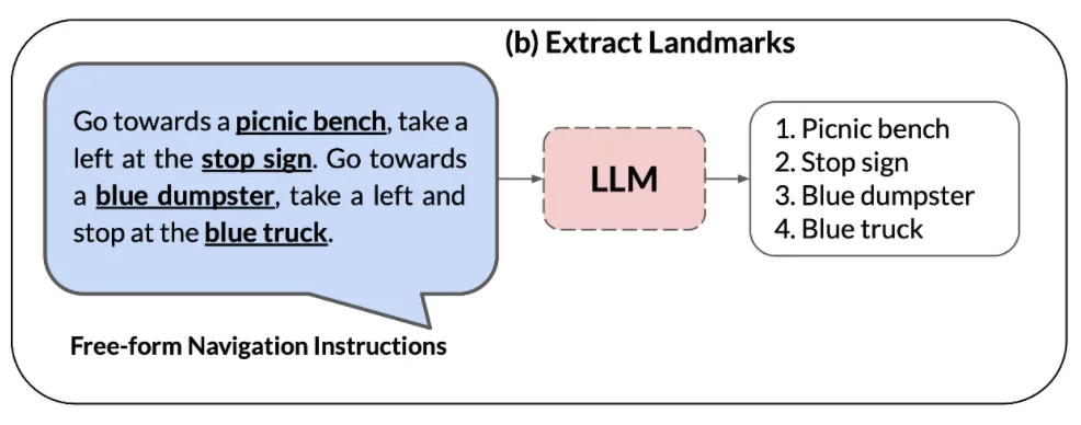 2、大型语言模型(LLM)用于将自然语言指令解析为一连串的特征点,这些特征点可以作为导航的中间子目标。