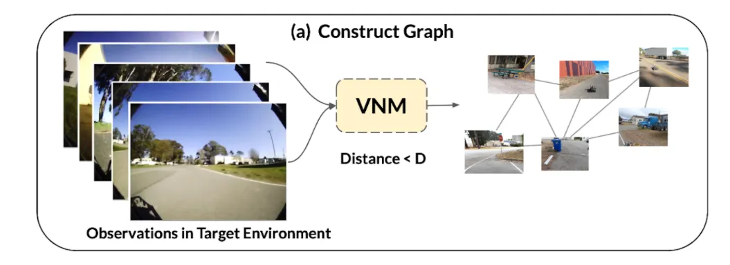 1、 给定目标环境中的一组观测值,使用目标条件距离函数,也就是视觉导航模型(VNM)的一部分,推断它们之间的连通性,并构建环境中连通性的拓扑图。