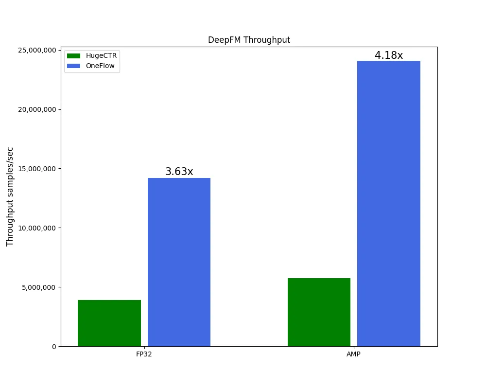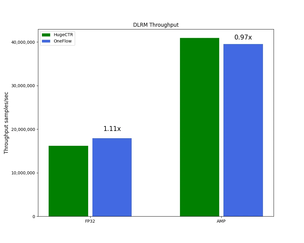 针对上述方案存在的问题,OneFlow 团队设计了 OneEmbedding,通过分层存储让单卡也能支持 TB 级模型的训练,通过横向扩展让模型容量没有天花板,通过 OneFlow 的自动流水线机制、算子优化和通信量化压缩等技术实现极致性能,在用法像 PyTorch 一样简单的前提下, OneEmbedding 在 DLRM 模型上性能是 TorchRec 的 3 倍以上,开启 TorchRec 没有支持的混合精度后,OneEmbedding 的性能更是 TorchRec 的 7 倍以上。
