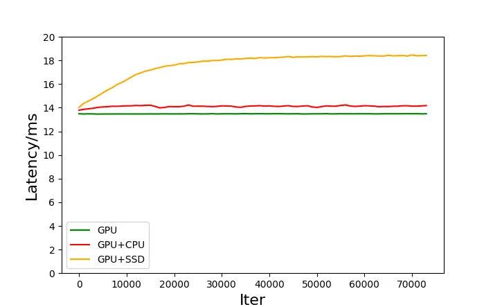 分别对三种存储方案进行测试。其中,测试用例与 MLPerf 的 DLRM 模型一致,参数规模约为 90GB。在使用 SSD 和 CPU 内存作为存储设备时,我们配置的 GPU 缓存大小为每个 GPU 12GB,相比于 90 GB 的总参数量,只能有一部分参数保持在 GPU 显存内,其他的参数则是保存在 CPU 内存或者 SSD 上,随着训练过程动态的换入到 GPU 缓存中来,测试结果如下图。