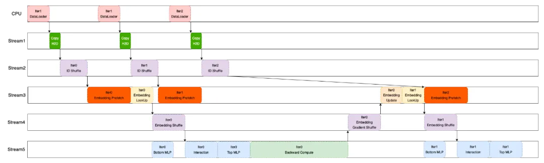 在 Embedding 数据查询交换的过程中,与 Embedding 操作无关的 Dense Feature 可以进入到 Bottom MLP 进行计算,在时间上进行重叠。完整的重叠执行时序如下图所示。