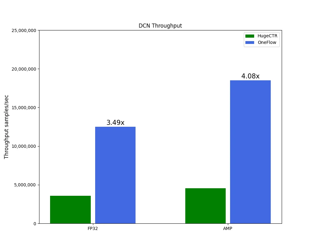 具体而言,在 DCN、DeepFM 两个模型上,无论是 FP32 还是混合精度(automatic mixed-precision, AMP)训练,OneEmbedding 的性能大幅超过 HugeCTR,而在 HugeCTR 深度优化以至于有点 “过拟合” 的 DLRM 模型上,OneEmbedding 性能与 HugeCTR 基本持平。