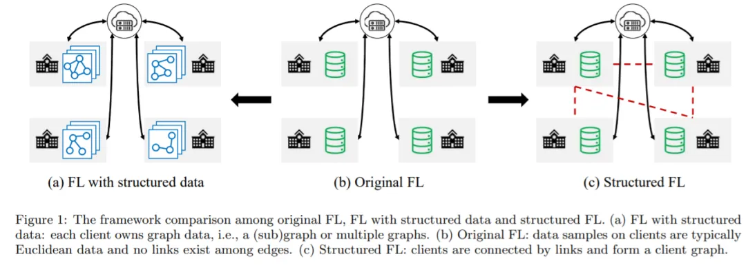 第一种是具有结构化数据的 FL,在具有结构化数据的 FL 中,客户基于其图数据协作训练图机器学习模型,同时将图数据保留在本地。