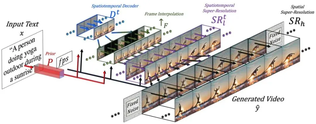Make-A-Video 的高级架构。给定由先验 P 翻译成图像嵌入的输入文本 x 和所需的帧速率 f ps ,解码器 Dt 生成 16 个 64 × 64 分辨率的帧,然后通过 ↑F 将其插值到更高的帧速率,并提高分辨率到 SRt l 为 256 × 256,SRh 为 768 × 768,最后生成高时空分辨率的视频 y^。