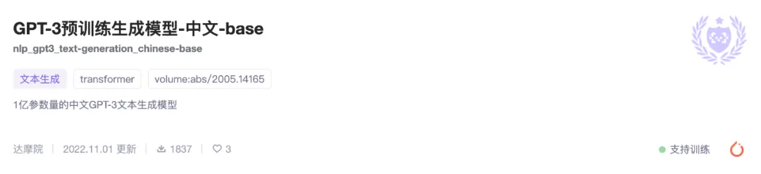 1 亿参数量的中文 GPT-3 文本生成模型,在魔搭社区获得了近两千次下载。