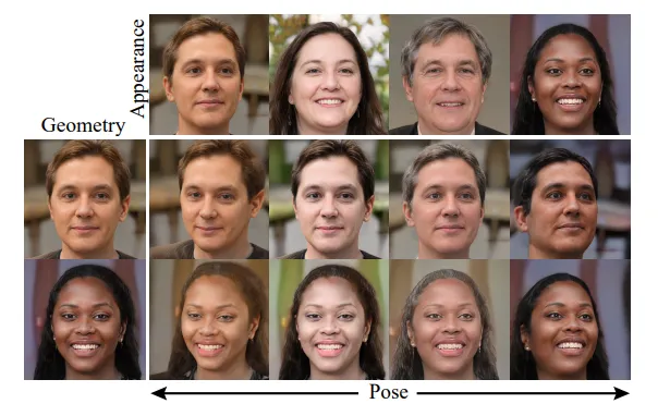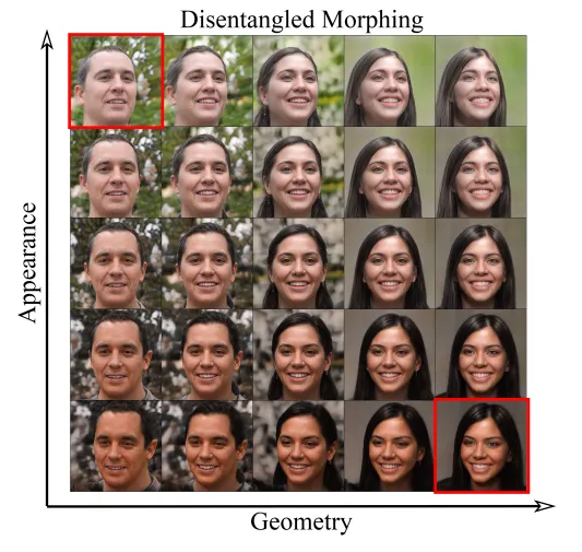 在此基础上,可以实现解耦的人脸插值变形应用,如下图以左上角和右下角作为起止点,对相机、几何、材质进行线性插值: