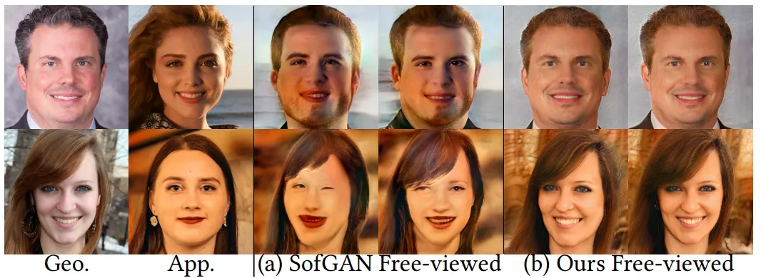 图 10 真实图像风格迁移的例子。可以看到 SofGAN 有一定的瑕疵,而且在身份上有一定变化。
