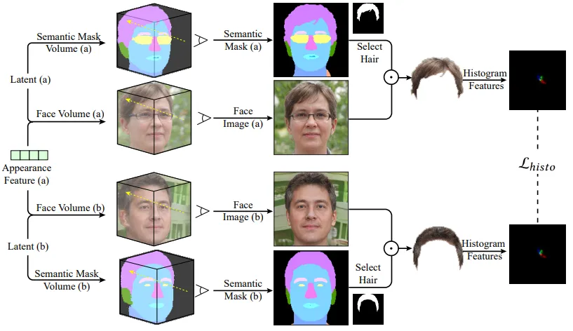 除此之外,为了约束拥有同一材质特征,但几何不同的样本渲染结果在材质上相似,NeRFFaceEditing 利用生成好的语义掩码,使用直方图特征来分别表示这些材质特征相同,几何不同的样本不同脸部组成部分,例如头发、皮肤等,在颜色上的分布。然后优化这些样本在各个组成部分上颜色分布的距离和。如下图所示: