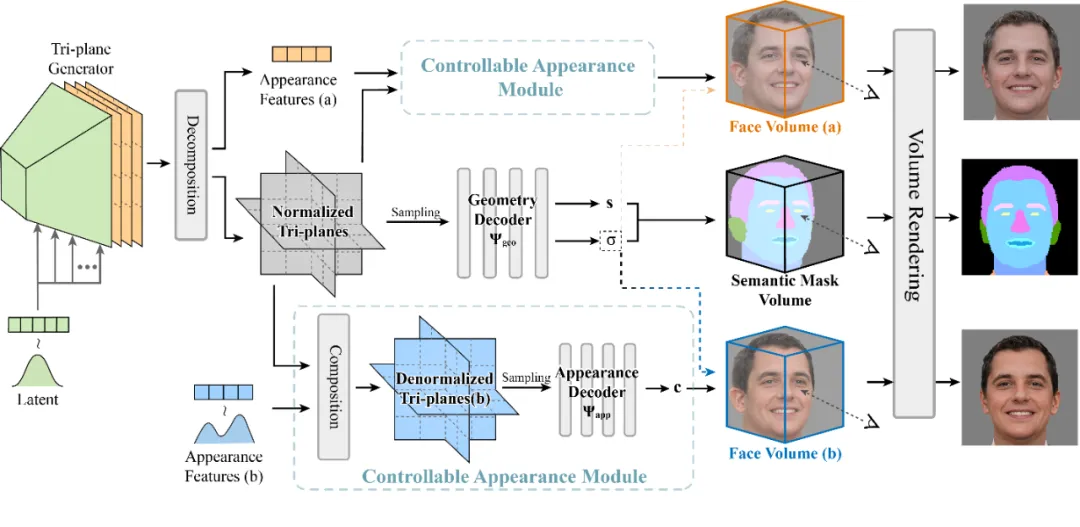 更进一步,为了实现对于几何和材质的解耦控制,NeRFFaceEditing 将原始的单个解码器分解为了几何解码器和材质解码器。几何解码器输入从标准化三平面采样得到的特征,预测密度和语义标签,用于表达三维人脸的几何和语义掩码体(Volume)。而几何特征与材质特征 (a) 通过可控制的材质模块(CAM)模块组合后,再从中采样特征输入材质解码器预测颜色。最后通过体渲染,得到某一视角下的人脸图像与对应的语义掩码。而在给定一个不同的材质特征 (b) 的情况下,几何特征与材质特征 (b) 通过 CAM 模块和体渲染可以得到另一张几何不变而材质改变的人脸图像。整体网络结构如下图所示: