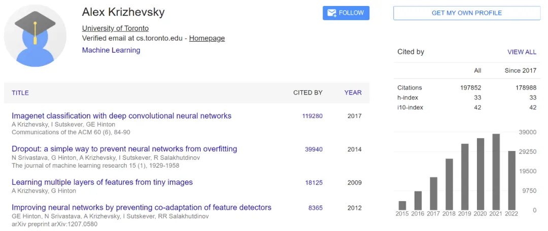 Alex Krizhevsky 为该论文的一作,是 Hinton 的博士生,此外他还是 CIFAR-10 和 CIFAR-100 数据集的创建者。他的许多关于机器学习和计算机视觉的论文经常被其他研究人员引用。