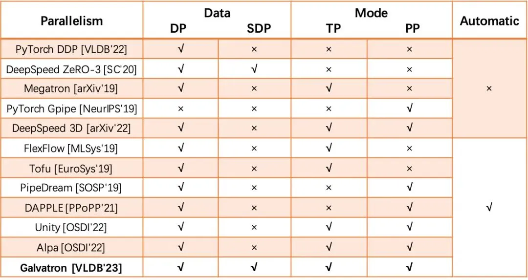 为了解决上述问题,研究者们提出了一些系列工作来探索混合并行的自动搜索:一类工作主要讨论了同时考虑数据并行和模型并行的搜索空间,代表性工作包括 FlexFlow,Tofu,另一类工作则产生于流水并行场景,将其与数据并行相结合,代表性工作包括 PipeDream,DAPPLE。在此基础上还有一些衍生工作,如 Unity、Alpa,进一步扩展了自动并行的探索范围。北大河图团队提出的系统「惊破天」Galvatron 同样属于自动并行搜索的研究领域,但相比于现有工作,该系统主要拥有以下三方面优势: