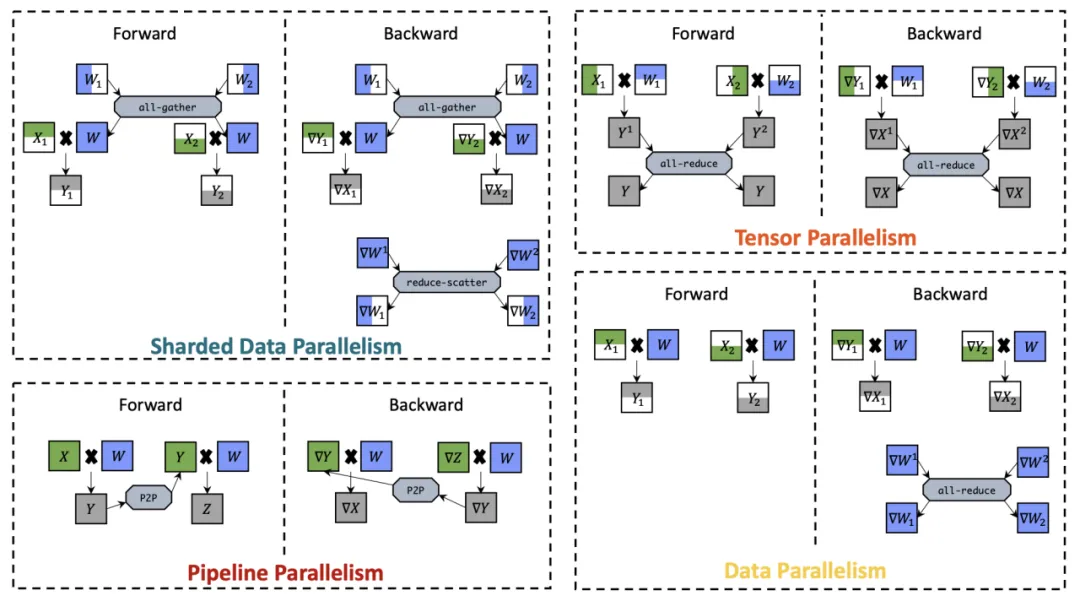 (1)多样性:首先,在并行方式方面,目前大模型的并行方式呈现出百花齐放的态势,即使是对于同一个算子,不考虑混合并行方式,不同的基础并行方式也会存在显著的差异,从而导致不同的内存开销、通信代价以及计算效率。下图展示了四种最主要的基础并行方式,即数据并行(Data Parallelism)、张量模型并行(Tensor Parallelism)、流水模型并行(Pipeline Parallelism)、分片数据并行 (Sharded Data Parallelism),在两张 GPU 上对于简单的矩阵乘法算子分布式执行的过程。