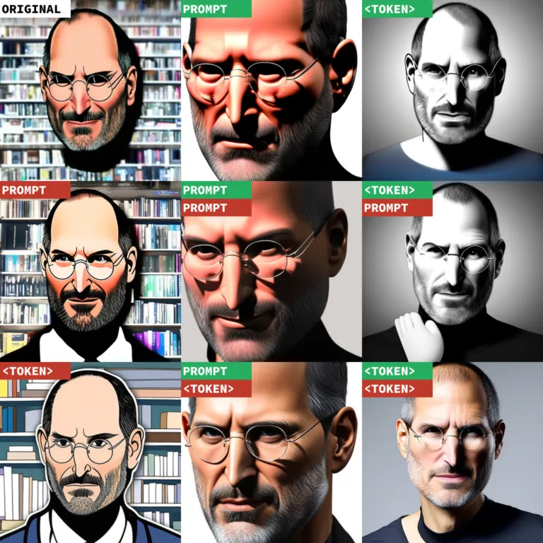 例如,Stable Diffusion 2.0 的一项测试输入可能是「cyberpunk forest by Salvador Dali, in the style of <midjourney>」以及一个negative prompt「in the style of <wrong>」分别对应绿色 “TOKEN” prompt 标签和红色“TOKEN” 标签。此外,每个单独生成的图像将以相同的初始潜态开始,同时进行 seeded 调度。这样能更清楚地显示negative prompt 的影响,因为在恒定初始潜态下保持相同 prompt 可以使生成的图像成分在negative prompt 改变的情况下保持不变。现在总算可以开始了。那就让我们以 Steve Jobs 的头像为基本 prompt 开始吧,相当简单。base prompt: Steve Jobs head, seed: 59049两个 prompt addition 都改变了风格;base prompt 生成的是卡通图像;写实的 prompt addition 使其更像是 3D 渲染,而 Midjourney token 又使其成为一种艺术手法。然而,当加入negative prompt,每张图像都更清晰,模糊度降低,色调呈中性,皮肤细节也更丰富。值得一提的是, <wrong> token 要优于较小的negative prompt。再来看一个经典的图像生成:用 original DALL-E 演示的著名牛油果扶手椅,怎么样?