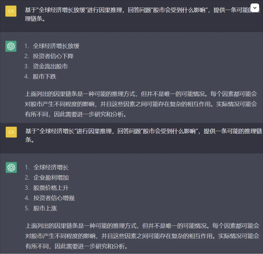而 ChatGPT 基于 “债券市场收益率快速下滑” 这一事实给出了单链多步推理的结果,推理过程存在一点和前提事实矛盾的地方— 由 “债券市场收益率快速下滑” 推理出了“债券收益率上升”。(如下图 2)