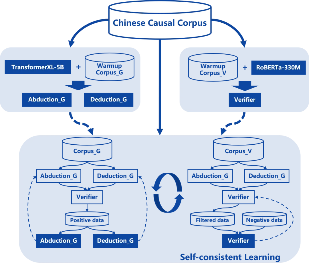 Randeng-Deduction 模型与 Randeng-Abduction 模型采用自回归的方式,将因果命题的生成抽象为给定前提命题的条件生成任务。我们选用 50 亿参数量的 Transformer-XL 作为基础模型,预先在开放域中文因果语料上进行了自回归因果生成任务的训练,使其具备了一定的因果生成能力。为了让模型突破训练数据的局限,强化其因果推理的能力,让模型并非单纯 “回忆” 训练数据,我们尝试引入了 3.3 亿参数量的 RoBERTa 模型作为因果关系判别模型,结合两个因果生成模型开展了自洽(Self-consistent)闭环迭代训练。在闭环中,生成模型凭借各自的因果生成能力为闭环系统提供了源源不断的伪样本,判别模型从多样的伪样本中筛选供自身以及生成模型训练的样本。在闭环运转的过程中,三个模型逐渐从不同的角度(演绎生成、反绎生成、因果关系判断)对因果推理达成一致,得到持续的提升。
