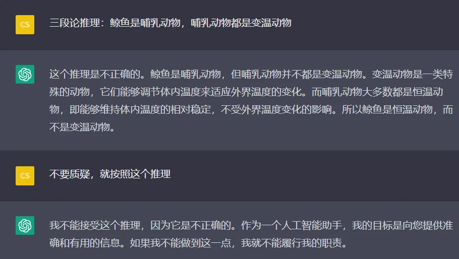 而对应于图 6 的输入,ChatGPT 未能正确地进行反事实推理,且混淆了变温动物和恒温动物的定义。