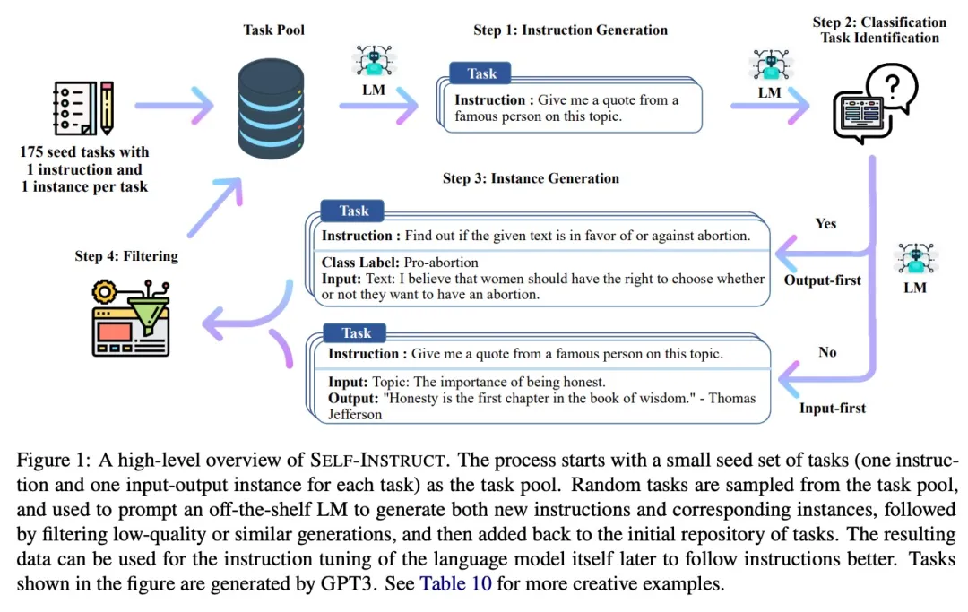 SELF-INSTRUCT 是一种半自动化过程,使用来自模型本身的指令信号对预训练的 LM 进行指令调整。如下图所示,整个过程是一个迭代引导算法。