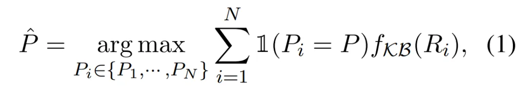 忠实的推理。我们可以使用函数 f_KB(R_i)来估算每个推理路径 R_i 的置信度,该函数建立在从知识库 KB 检索的相关知识 K_1、……、K_M 基础之上。最终的预测可以通过运用以下推断过程来获得: