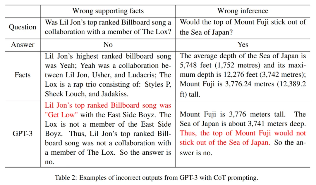 错误的支持事实。如表 2 所示,GPT-3 为 Lil Jon 在 Billboard 榜单中排名最高的歌曲提供了错误的事实支持,指出排名最高的歌曲是 Get Low 而非正确答案 Yeah。另外,GPT-3 还做出了错误的推理,即富士山的山顶不会高于日本海,而不是正确答案会高于。