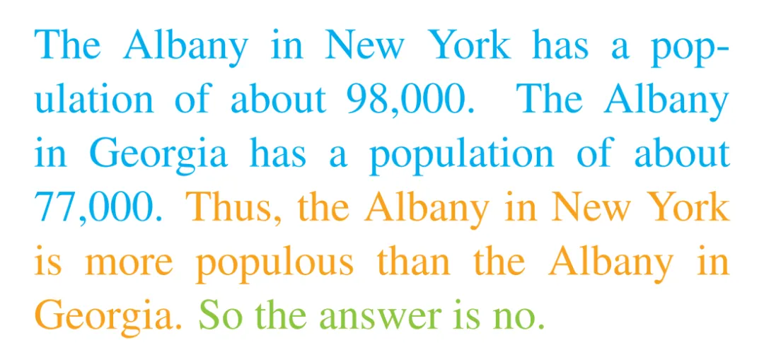 该研究在 StrategyQA 数据集上展示了带有 CoT prompting 方法的关于 GPT-3 的分析。在仔细检查 GPT-3 的输出后,该研究观察到 RR 可以为许多问题提供合理的解释和正确的预测。例如,当给出「佐治亚州的奥尔巴尼会在纽约州的奥尔巴尼之前先达到十万名住户吗?」这个问题时,GPT-3 产生了以下输出: