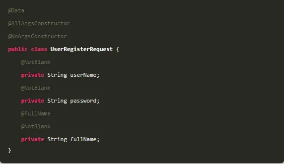 @PostMapping("/sign-up") public ResponseEntity signUp(@RequestBody @Valid UserRegisterRequest userRegisterRequest) { userService.save(userRegisterRequest); return ResponseEntity.ok().build(); }