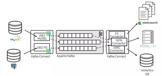 一旦更改事件位于Apache Kafka中,来自Kafka Connect生态系统的不同连接器就可以将更改流到其他系统和数据库,如Elasticsearch、数据仓库和分析系统或Infinispan等缓存。根据所选的接收连接器,可能需要应用Debezium的新记录状态提取SMT,它只会将“after”结构从Debezium的事件信封传播到接收连接器。