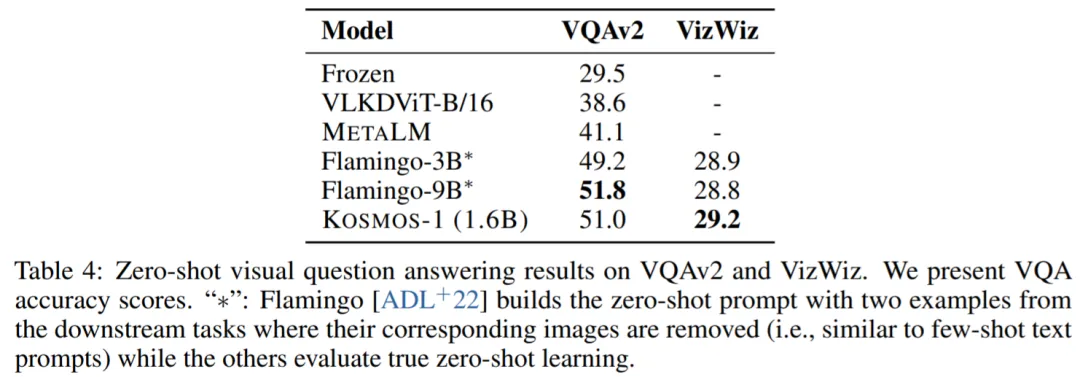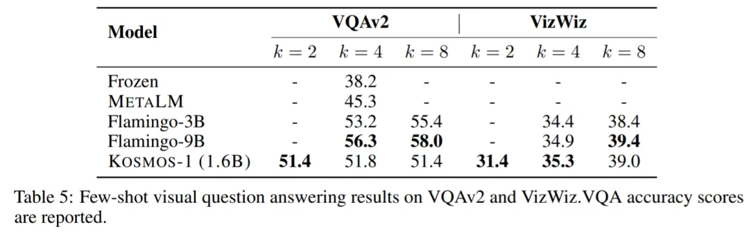 视觉问答。KOSMOS-1 比 Flamingo-3B 和 Flamingo-9B 模型具有更高的准确率和鲁棒性: