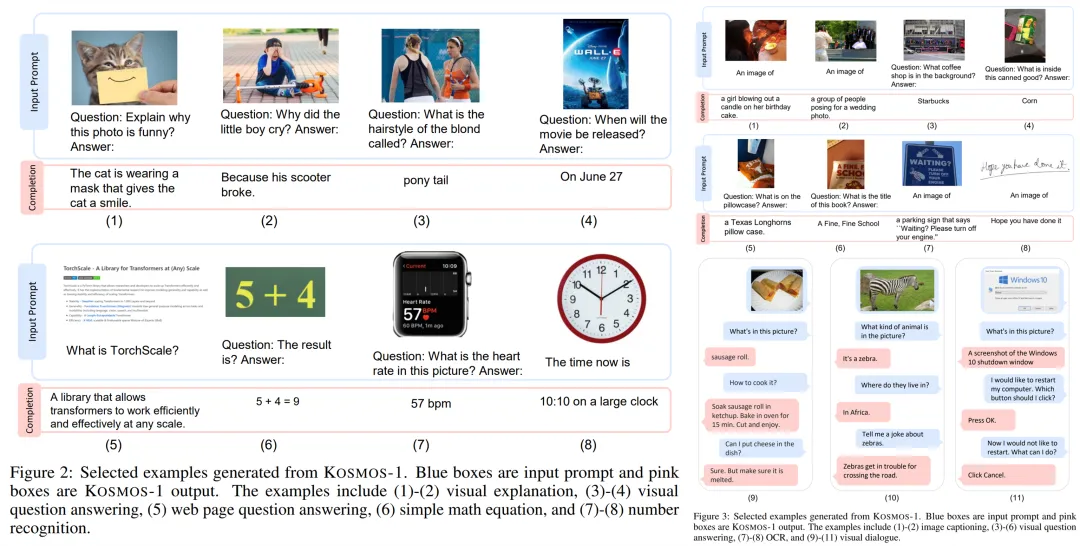 这些示例表明,多模态感知的原生支持为将 LLM 应用于新任务提供了新的机遇。此外与 LLM 相比,MLLM 实现了更好的常识推理性能,表明了跨模态迁移有助于知识获取。
