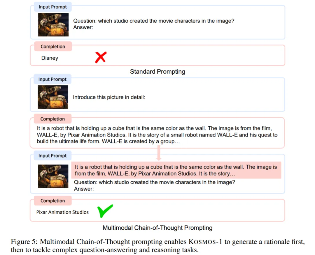 多模态思维链提示。受思维链提示的启发,本文对这方面进行了实验。如图 5 本文将感知语言任务分解为两个步骤。在第一阶段给定图像,使用提示来引导模型生成符合要求的输出,以产生最终结果。