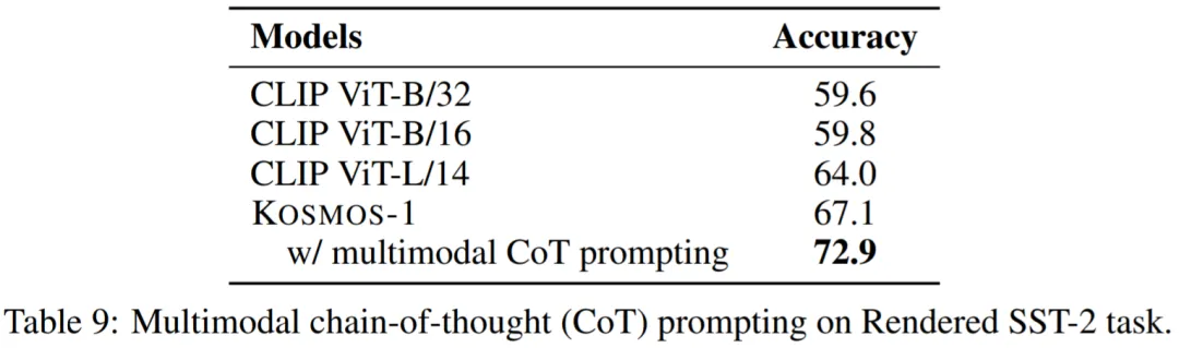 从表 9 可以看出,多模态思维链提示的得分为 72.9 分,比标准提示高出 5.8 分: