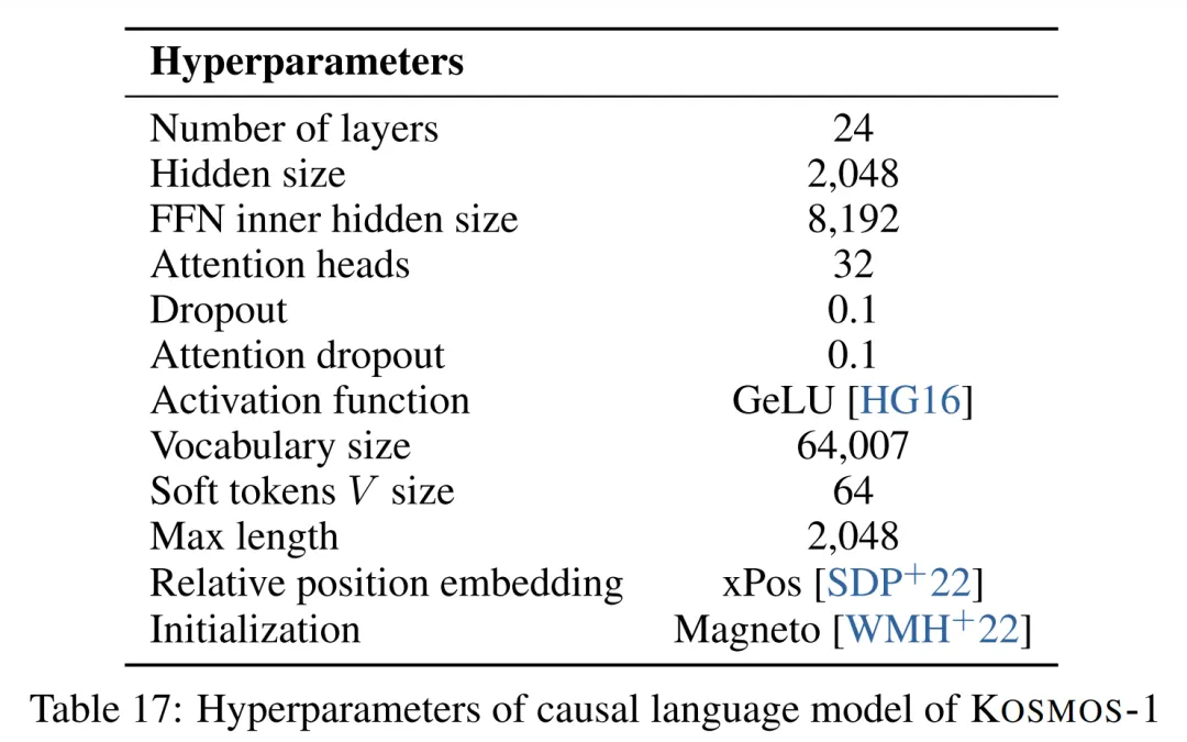 数据集有了,然后是训练设置。MLLM 组件包含 24 层、隐藏维度是 2048、8192 个 FFN 和 32 个注意力头、参数量为 1.3B。为了使模型更好的收敛,图像表示是从具有 1024 个特征维度的预训练 CLIP ViT-L/14 模型获得的。图像在训练过程中被预处理为 224×224 分辨率,此外,训练期间除了最后一层,所有的 CLIP 模型参数被冻结。KOSMOS-1 的参数总数约为 1.6B。