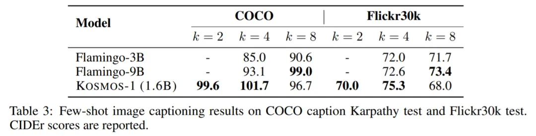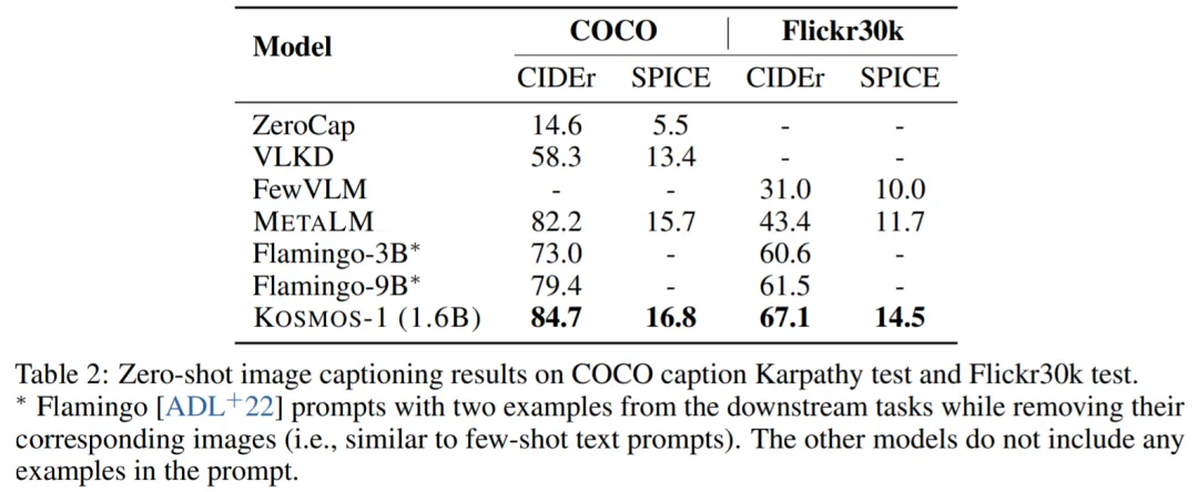 图像字幕。下表给出了不同模型在 COCO 和 Flickr30k 上的零样本性能。相比其他模型,KOSMOS-1 均取得了显著效果,甚至在参数量远小于 Flamingo 的基础上,性能也不错。