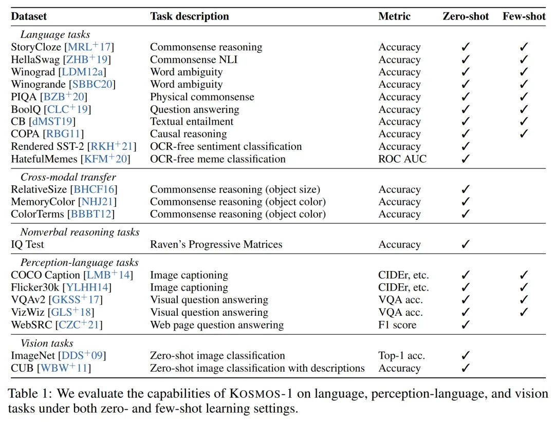 最终,KOSMOS-1 模型原生支持零样本和少样本学习设置下的语言、感知语言与视觉任务,具体如下表 1 所示。