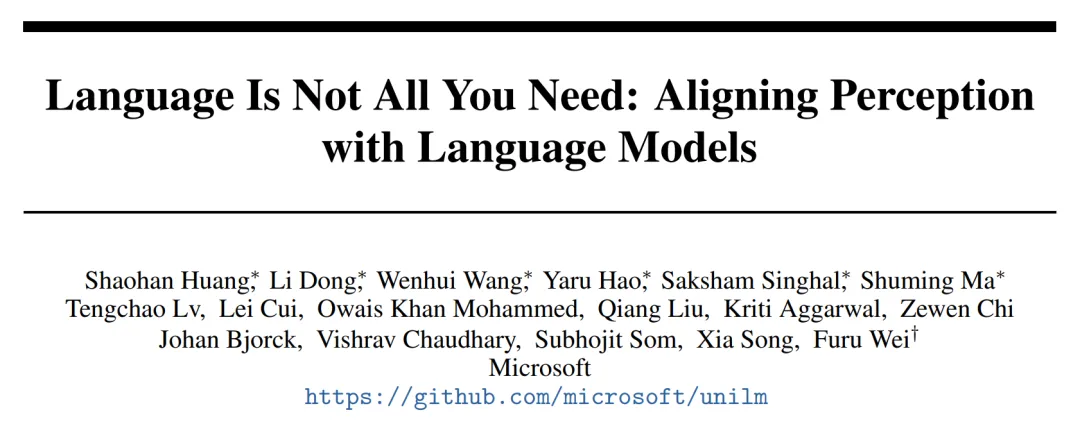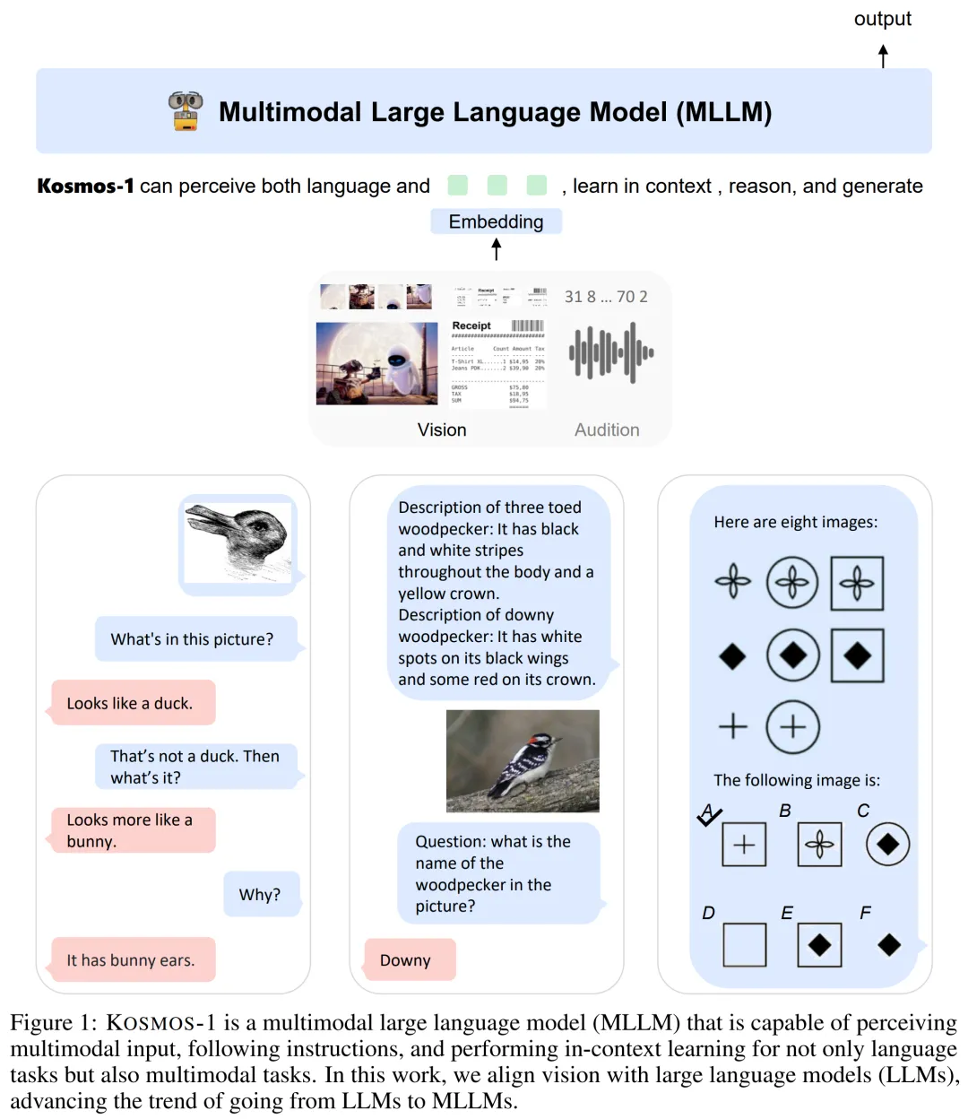 尽管 LLM 在 NLP 任务中取得了成功的应用,但研究人员仍努力将其原生地用于图像和音频等多模态数据。作为智能的基本组成部分,多模态感知是实现通用人工智能的必要条件,无论是对于知识获取还是与现实世界打交道。更重要的是,解锁多模态输入能够极大地拓展语言模型在更多高价值领域的应用,比如多模态机器人、文档智能和机器人技术。