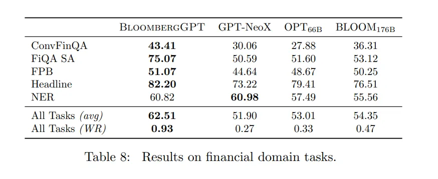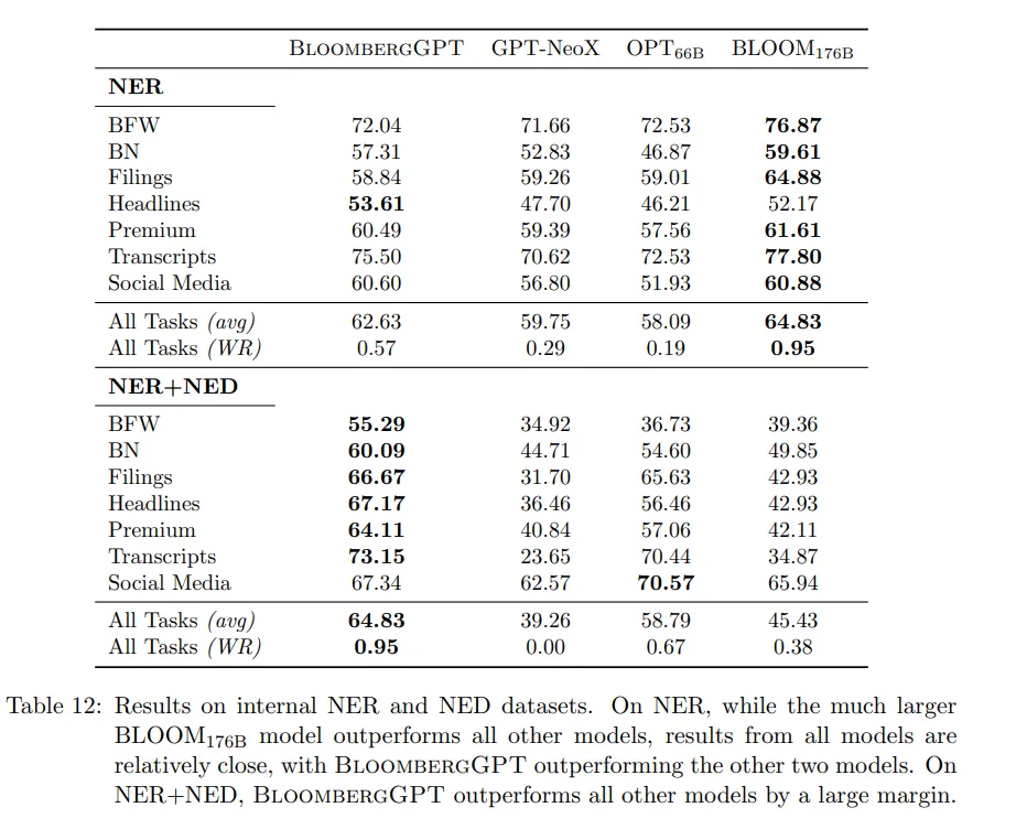 从外部的金融任务结果来看,BloombergGPT 在五个任务中的四个任务(ConvFinQA、FiQA SA、FPB 和 Headline)中均取得了最好的表现,在 NER 中排名第二(表 8)。