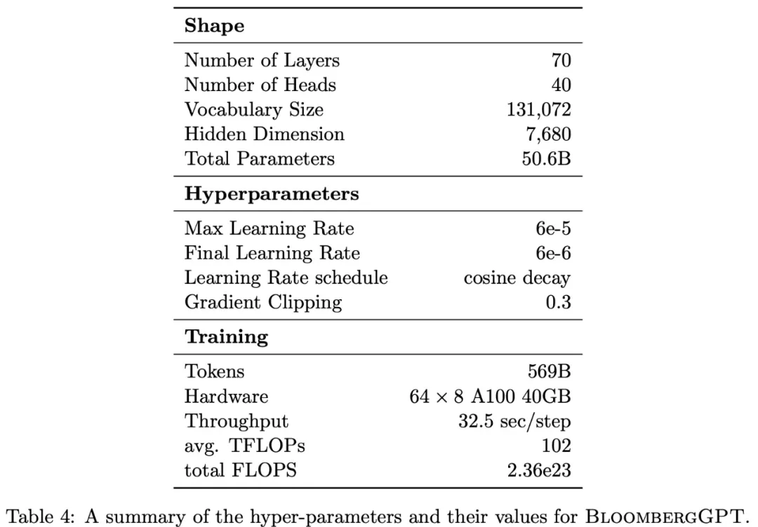 最终,该研究确定使用 40 个注意力头,每个注意力头的维度为 192,导致总隐藏维度 D = 7680 ,总计 50.6B 个参数。下表 4 总结了 BloombergGPT 中使用的超参数。
