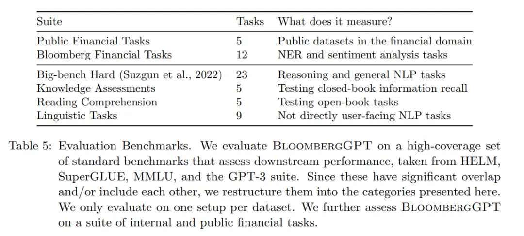 研究人员评估了 BloombergGPT 在两大类任务上的表现:金融特定任务和通用任务。每种类型的任务数量和组的定义如下表所示。
