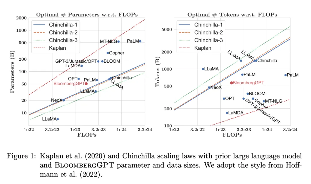 下图 1 提供了一个 scaling law 的总结,以及 BloombergGPT 与其他模型的比较。