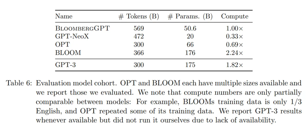 研究人员根据模型大小、训练数据类型、整体性能以及最重要的访问权限,将 BloombergGPT 与三个最接近的模型进行比较。表 6 中提供了模型大小和计算的概述。